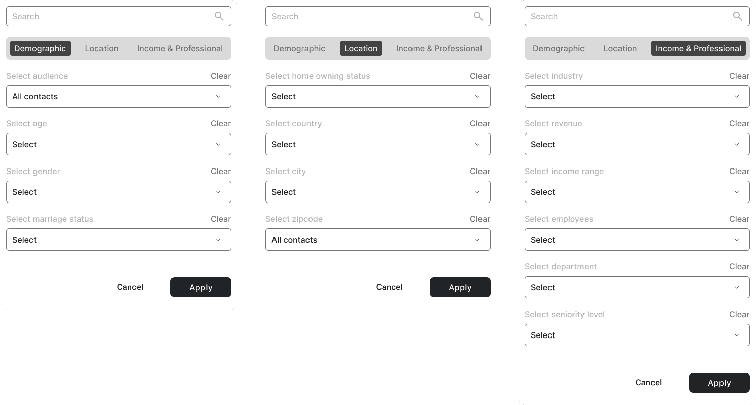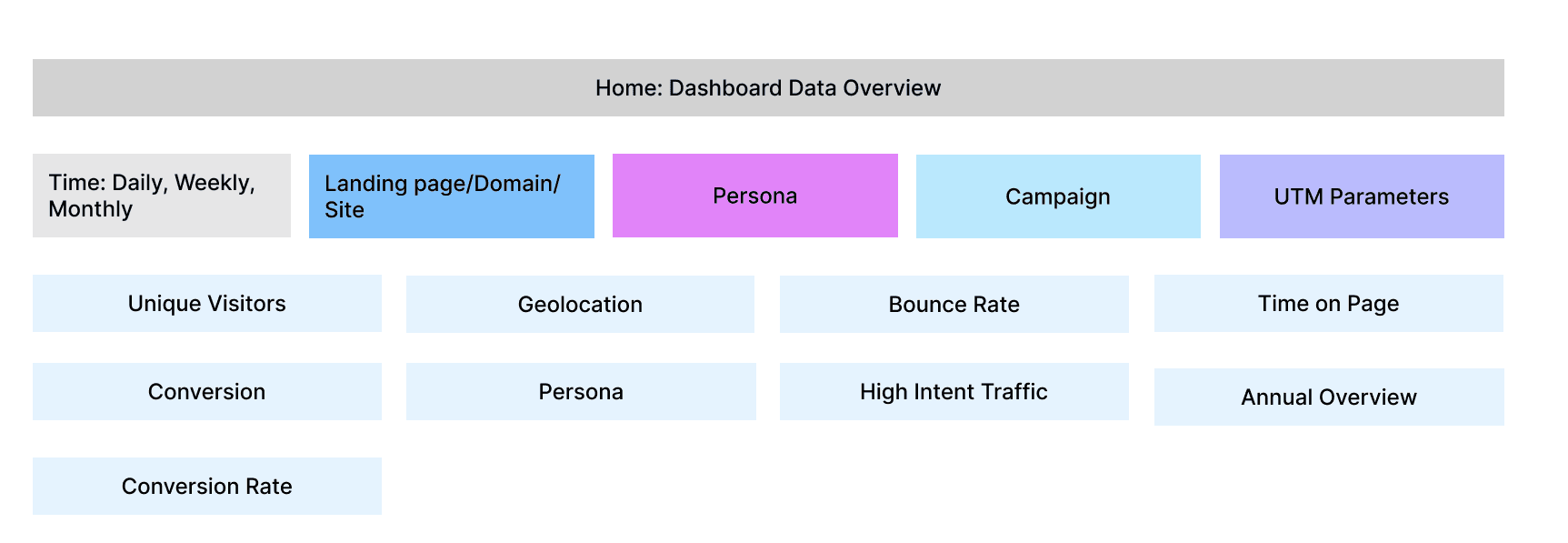 Within the dashboard, we've established filter system of time, domain, persona, campaign and UTM parameters.